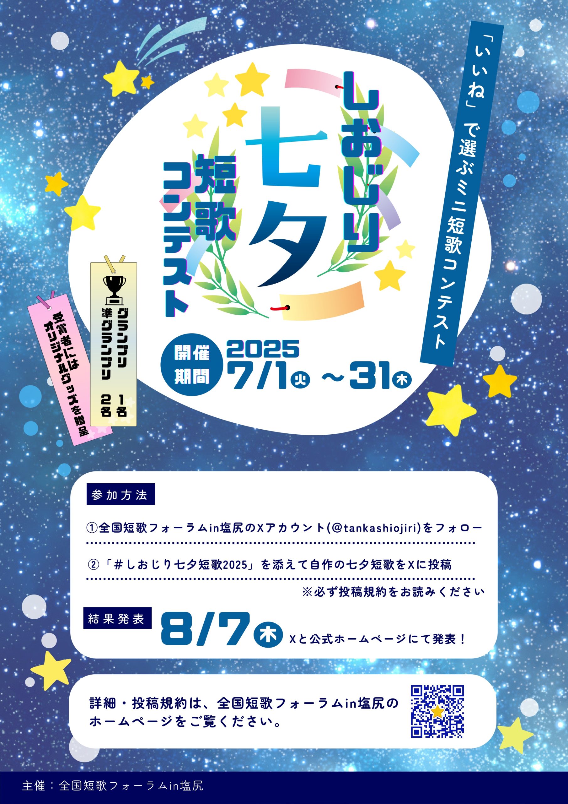 X(旧Twitter)上にて7月1日(火)~7月31日(木)の期間でミニ短歌コンテスト「しおじり七夕短歌コンテスト」を開催します。